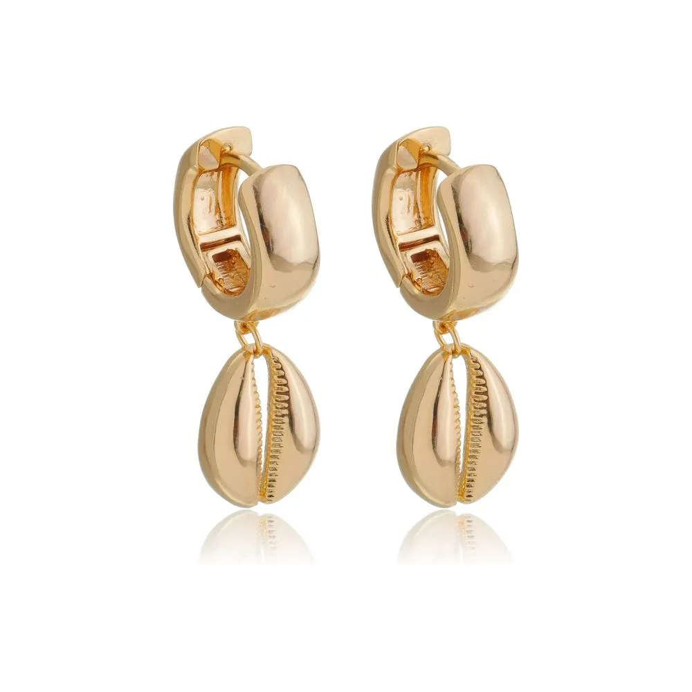 Argolas leves com pingente de búzio polido, que acompanha o movimento com fluidez.