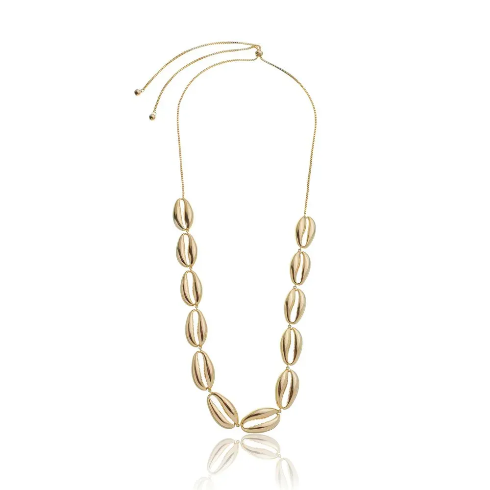 Corrente delicada com pingentes de búzios polidos, como se tivessem sido colhidos diretamente da areia.